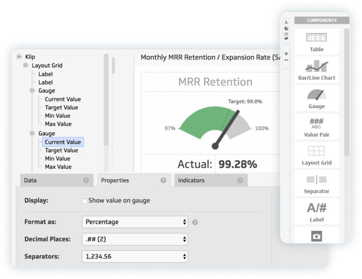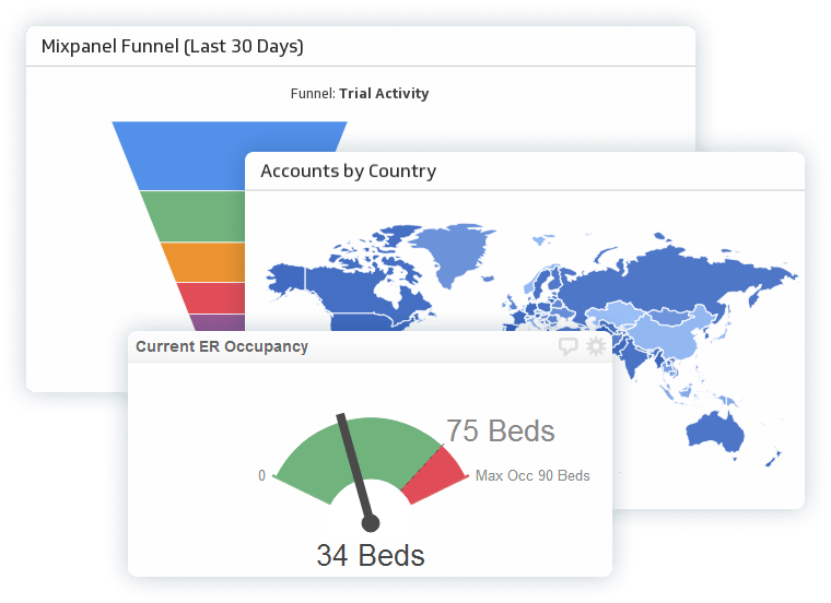 With 30+ chart types to choose from, there’s a visualization for every need. From pie, bar, and line charts to more comprehensive charts like gauges, pictographs, maps, or funnels.